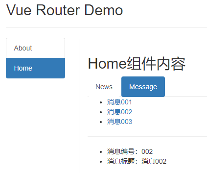 1 2 3 4 5 6 7 8 9 10 11 12 13 14 15 16 17 18 19 20 { path :'/home' , component :Home , children :[ { path :'news' , component :News }, { component :Message , children :[ { name :'xiangqing' , path :'detail/:id/:title' , component :Detail } ] } ] }