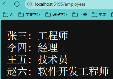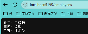 3、ASP.NET应用(Http GET) 1 2 3 4 5 6 7 8 9 10 11 12 13 14 15 16 17 18 19 20 21 22 23 24 25 26 27 28 29 30 31 32 33 34 35 36 37 38 39 40 41 42 43 44 45 46 47 48 49 50 51 52 53 54 55 56 57 58 59 var builder = WebApplication.CreateBuilder(args );var app = builder.Build();app.Run(async (HttpContext context) => { context.Response.ContentType = "text/plain; charset=utf-8" ; if (context.Request.Method == "GET" ) { if (context.Request.Path.StartsWithSegments("/" )) { await context.Response.WriteAsync($"该请求的方法是{context.Request.Method} \r\n" ); await context.Response.WriteAsync($"该请求的路径是{context.Request.Path} \r\n" ); await context.Response.WriteAsync($"\r\n该请求的请求头有\r\n" ); foreach (var key in context.Request.Headers.Keys) { await context.Response.WriteAsync($"{key} :{context.Request.Headers[key]} \r\n" ); } await context.Response.WriteAsync($"该请求的请求体是{context.Request.Body} \r\n" ); } else if (context.Request.Path.StartsWithSegments("/employees" )){ var employees = EmployeesRepository.GetEmployees(); foreach (var employee in employees) { await context.Response.WriteAsync($"{employee.Name} : {employee.Position} \r\n" ); } } } }); app.Run(); static class EmployeesRepository { private static List<Employee> employees = new List<Employee> { new Employee(1 , "张三" , "工程师" , 60000 ), new Employee(2 , "李四" , "经理" , 75000 ), new Employee(3 , "王五" , "技术员" , 50000 ) }; public static List<Employee> GetEmployees () => employees; } public class Employee { public int Id { get ; set ; } public string Name { get ; set ; } public string Position { get ; set ; } public double Salary { get ; set ; } public Employee (int id, string name, string position, double salary ) { Id = id; Name = name; Position = position; Salary = salary; } }